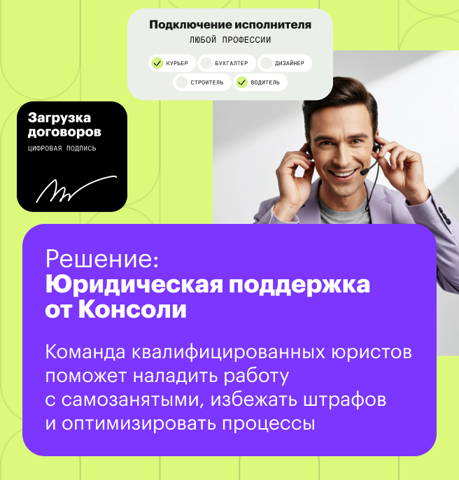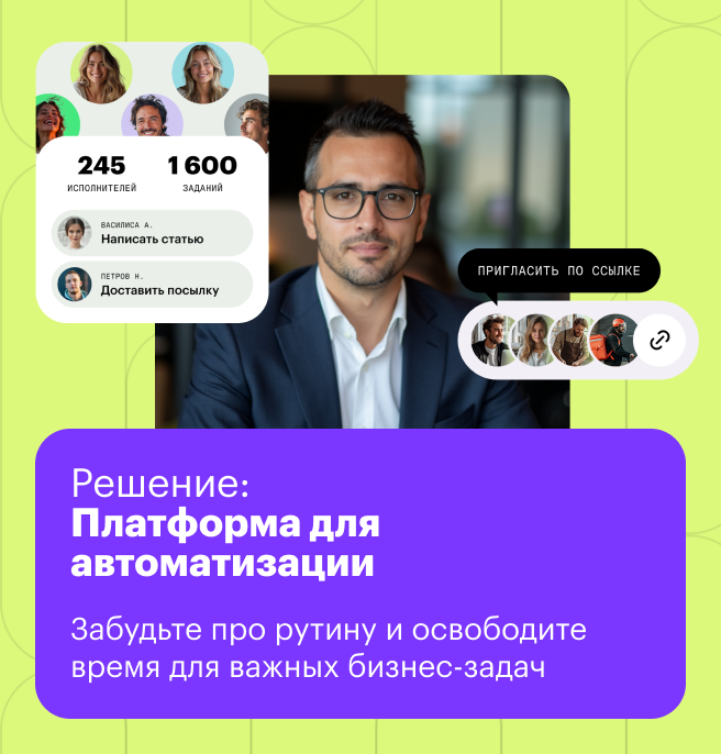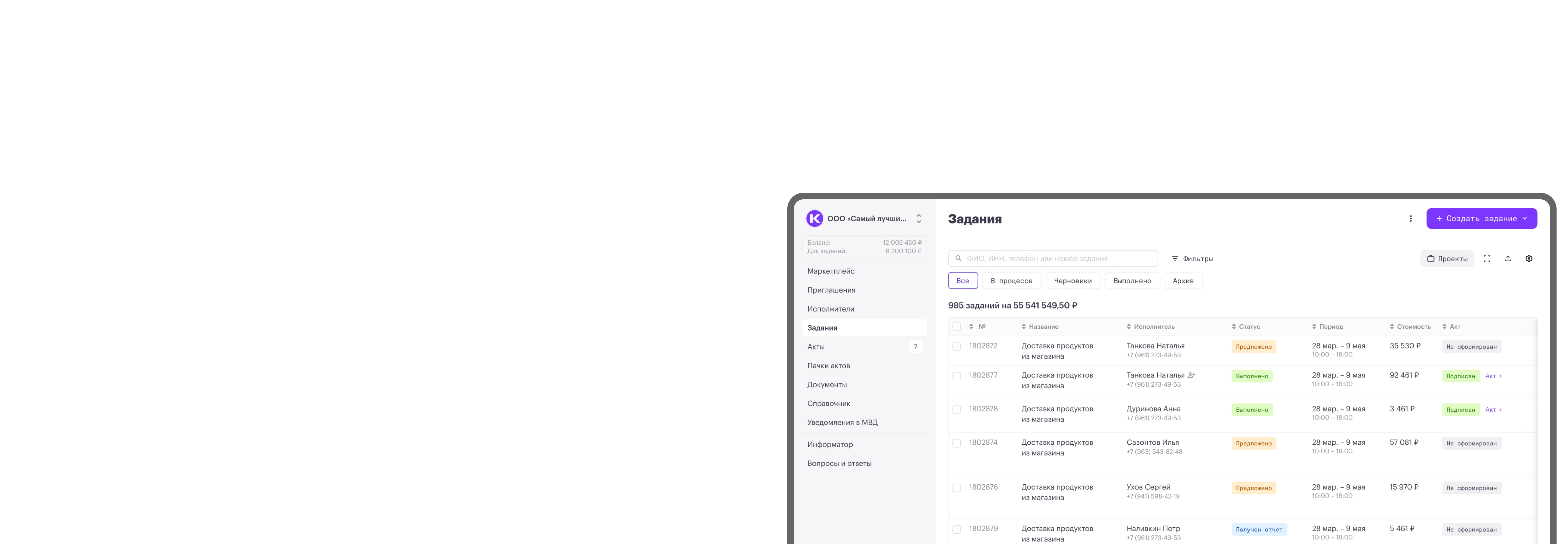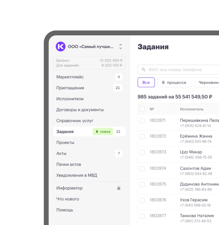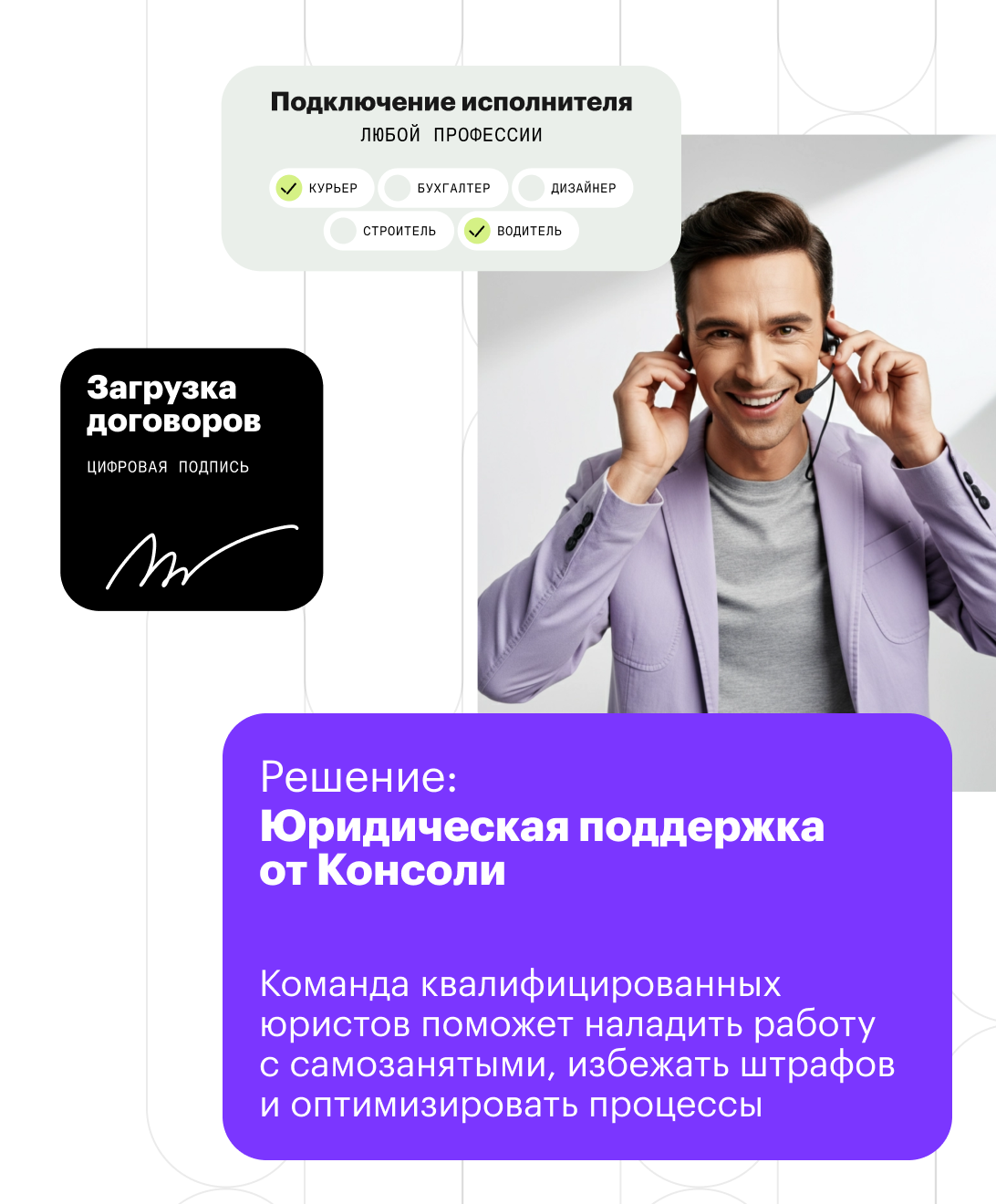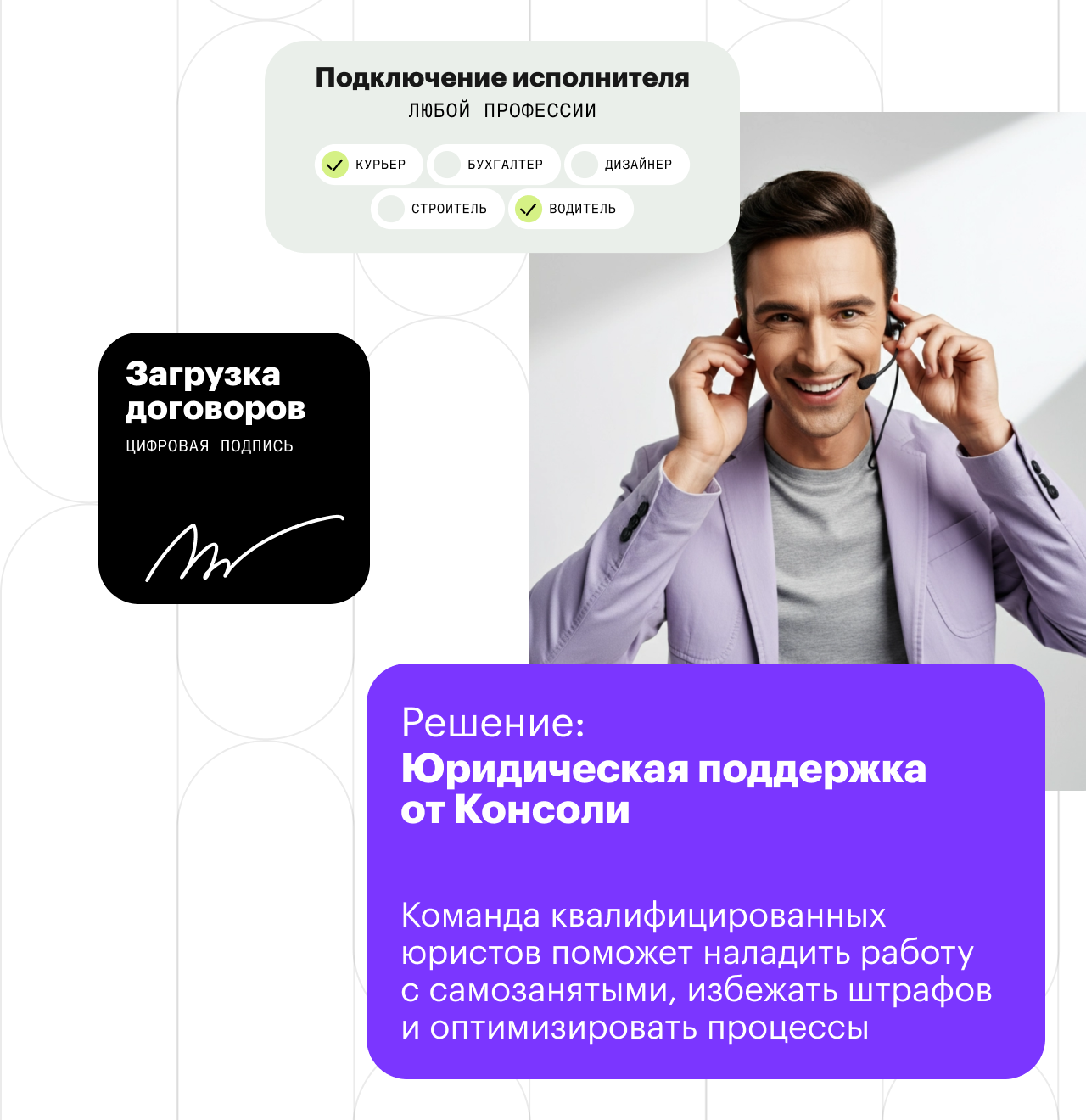Платформа поддерживает все виды оформления исполнителей, с учетом особенностей каждого статуса: самозанятые, ИП, ГПХ и нерезиденты.