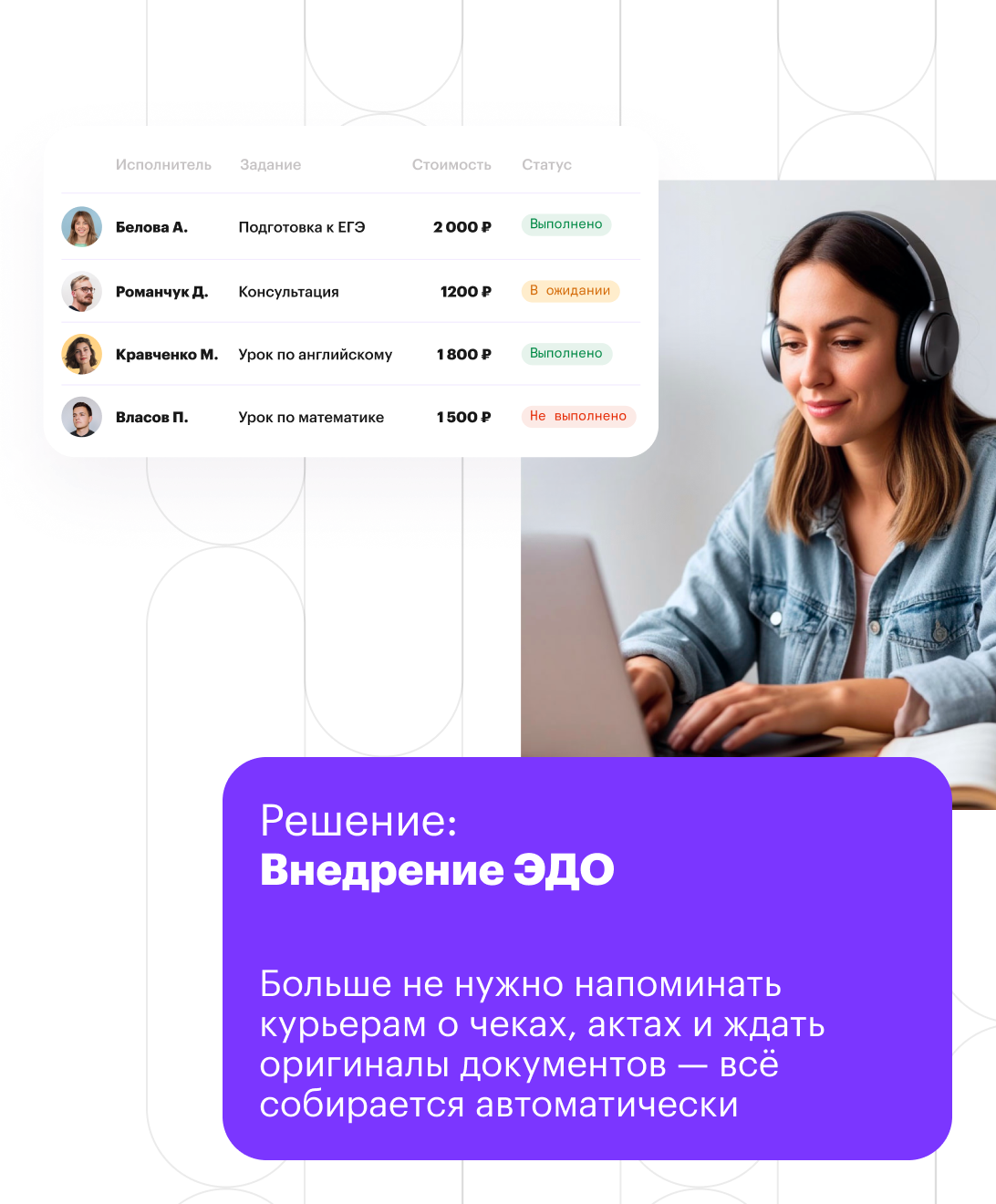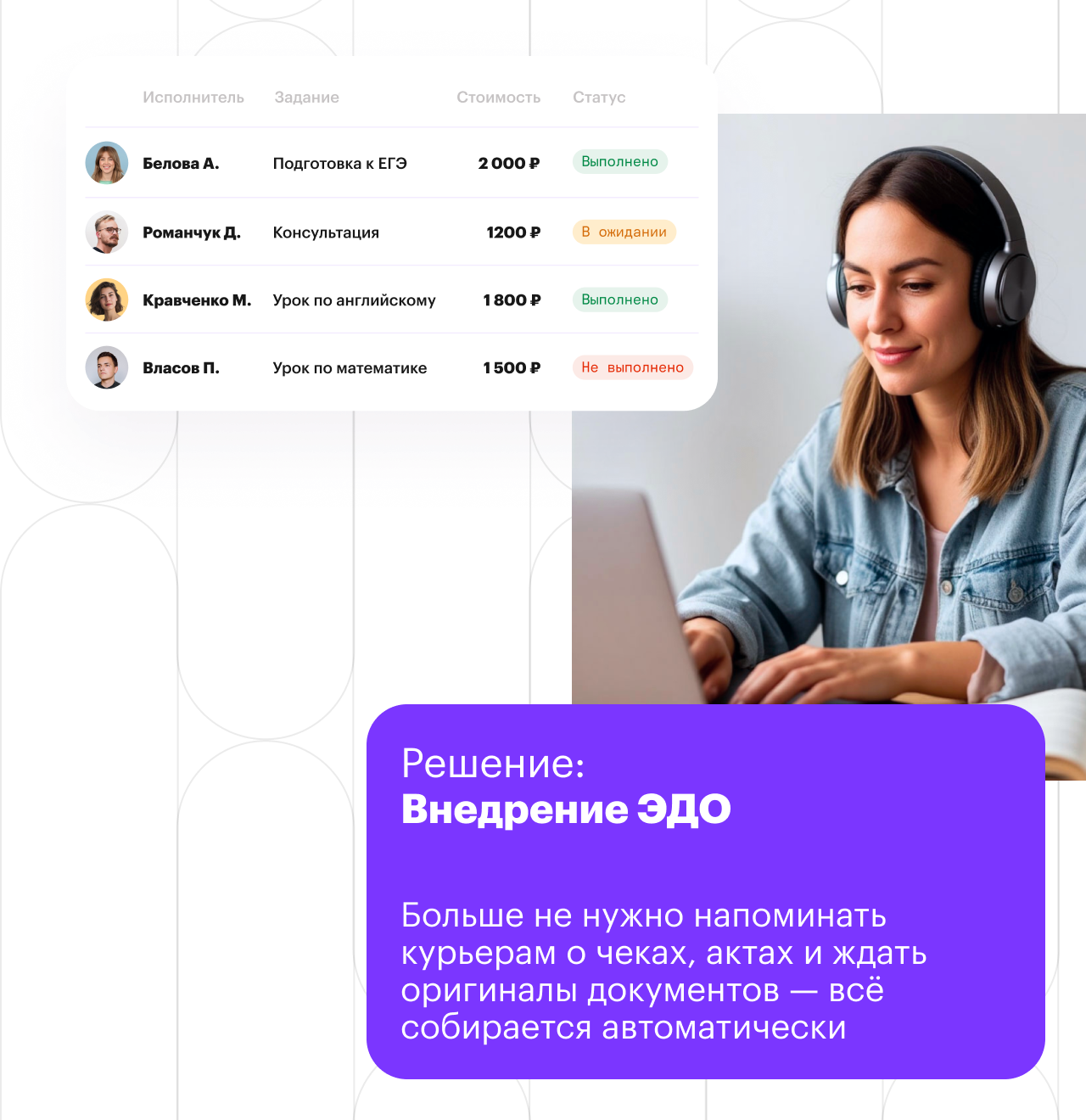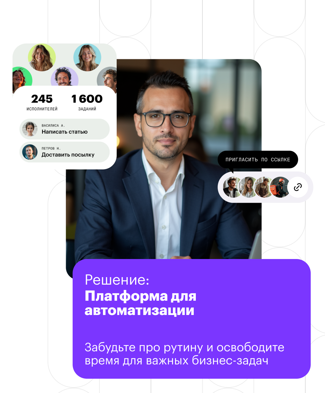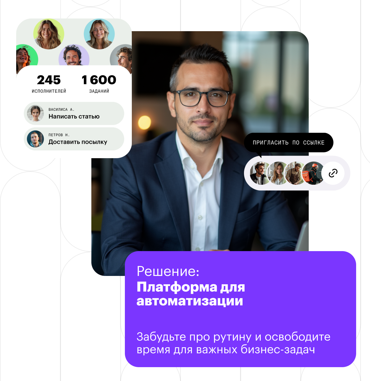 Платформа поддерживает все виды оформления исполнителей, с учетом особенностей каждого статуса: самозанятые, ИП, ГПХ и нерезиденты.