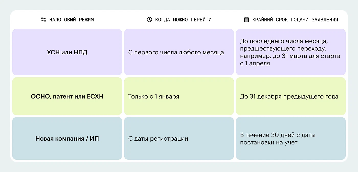 Момент перехода зависит от того, на каком налоговом режиме вы находитесь сейчас. Сроки перехода на АУСН из других налоговых режимов есть на изображении.