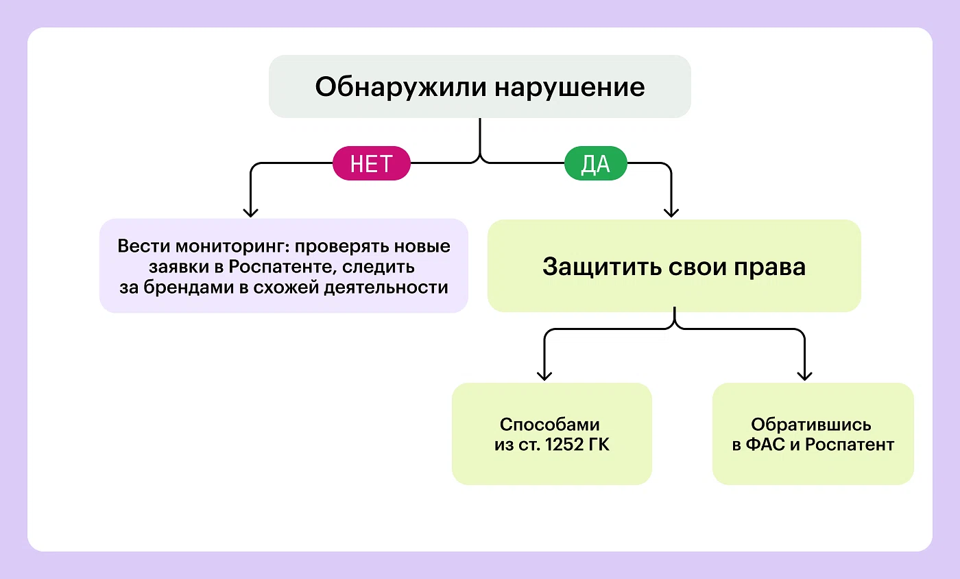 Любое использование вашего товарного знака без разрешения — нарушение закона. Чтобы защитить товарный знак, используйте методы из ст. 12 и 1252 ГК: