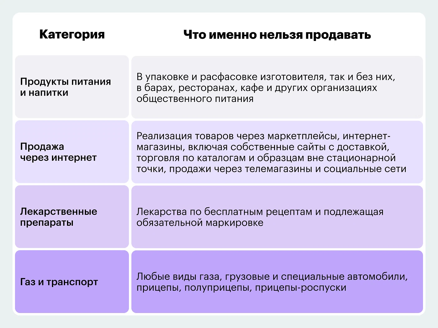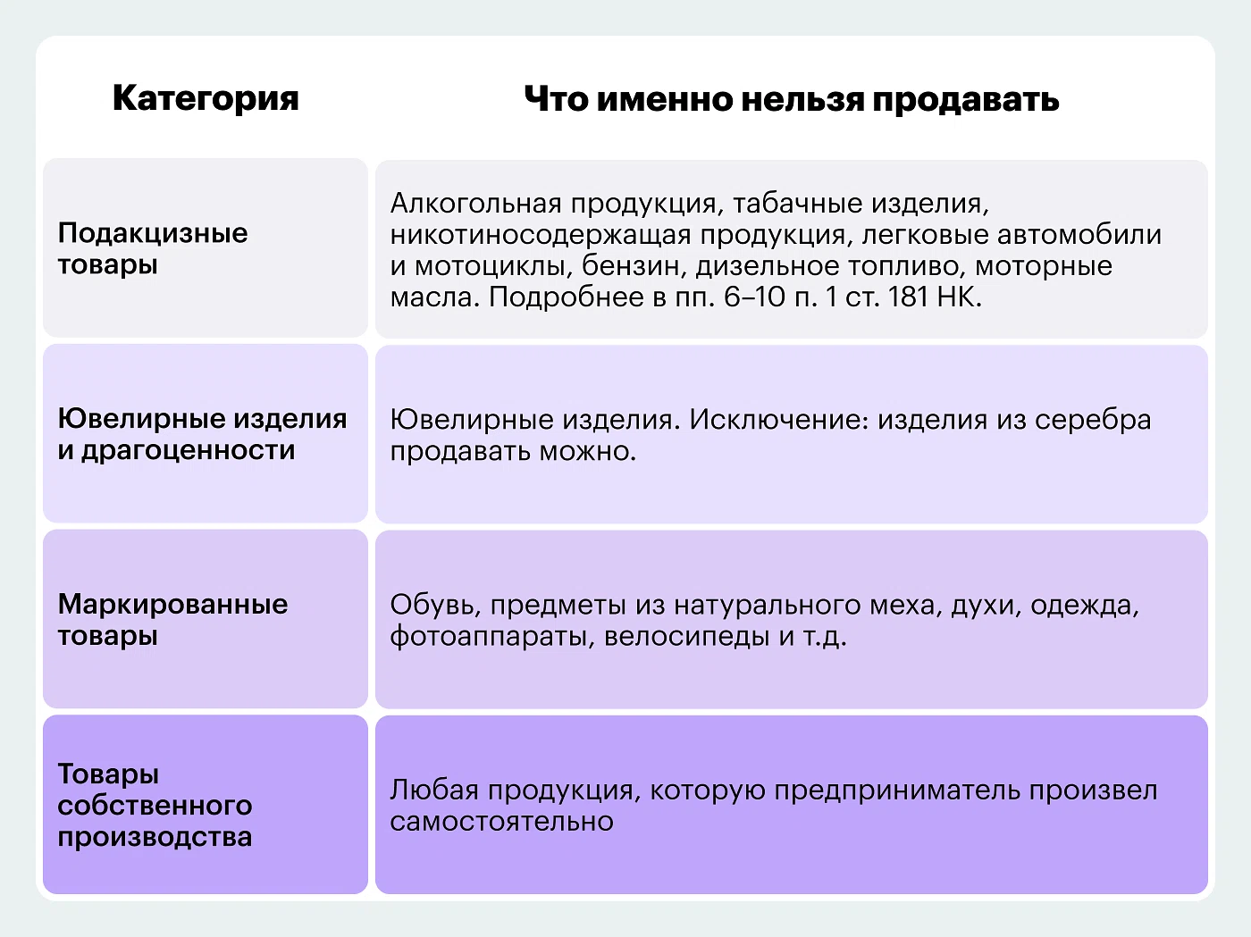 Вид деятельности. Несмотря на неблагоприятные прогнозы, патент для розничной торговли сохранили. На патенте остаются все виды патентов для ип на 2026 год — стационарные и нестационарные. Но здесь стоит разобраться, что можно продавать на патенте, а что нет (пп. 1 п. 3 ст. 346.43 НК).