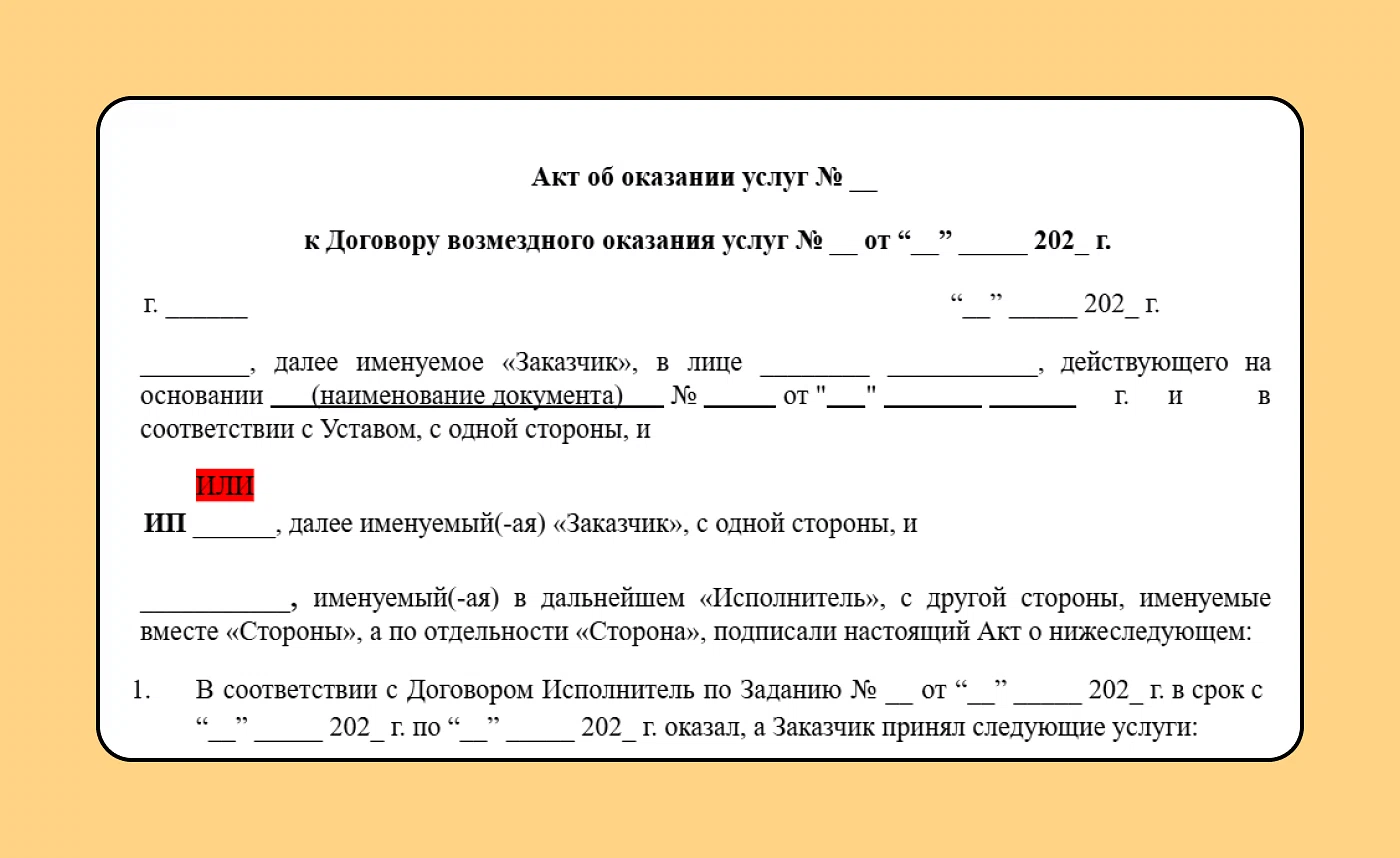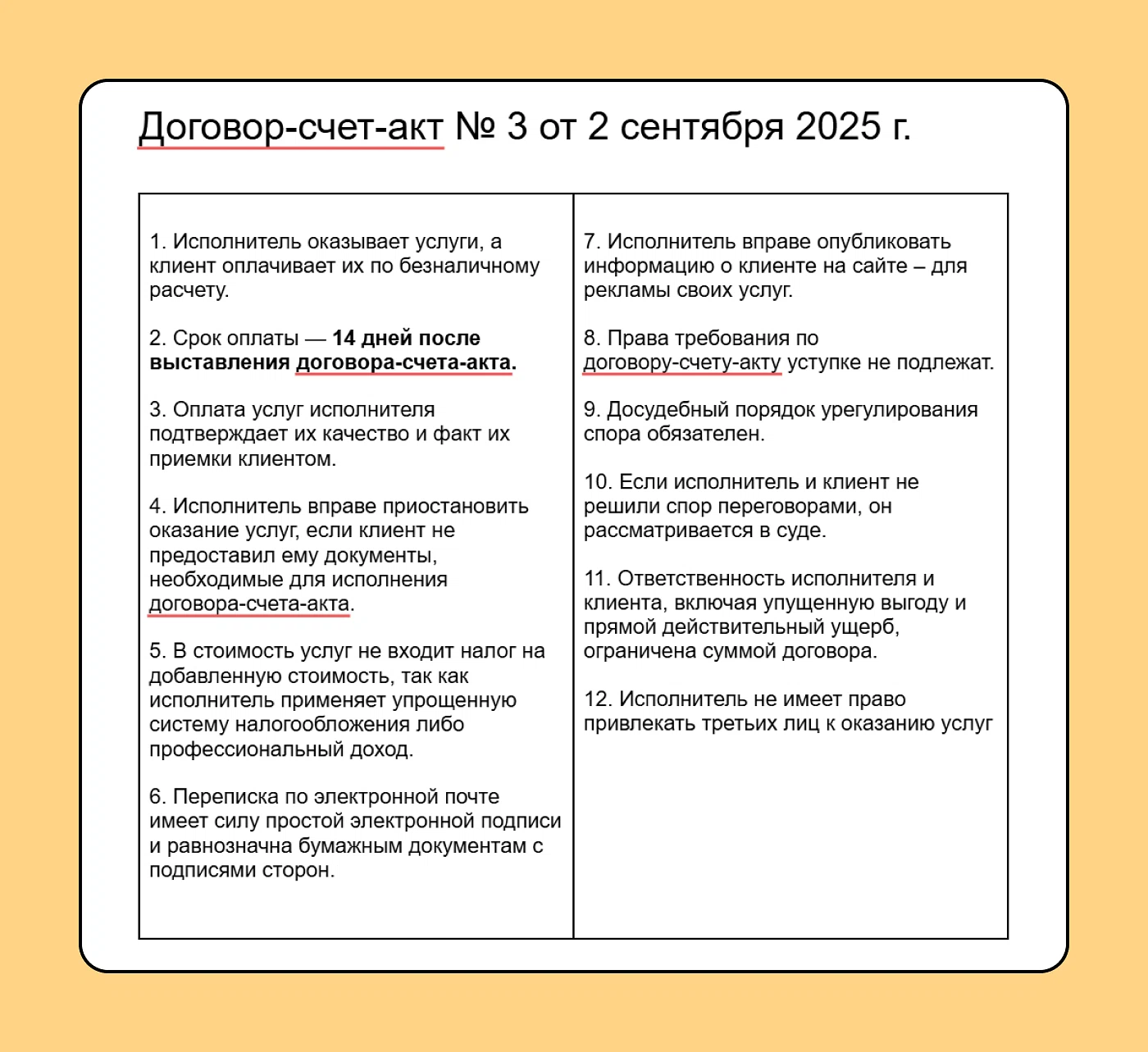 Частный случай документа — договор-счет-акт. Он описывает все ключевые условия, подтверждает прием заказа и устанавливает цену. Договор-счет-акт подойдет, если работа фрилансера понятная и простая, не требует поэтапных согласований: написать небольшой текст, придумать дизайн логотипа, вычитать статью на ошибки.