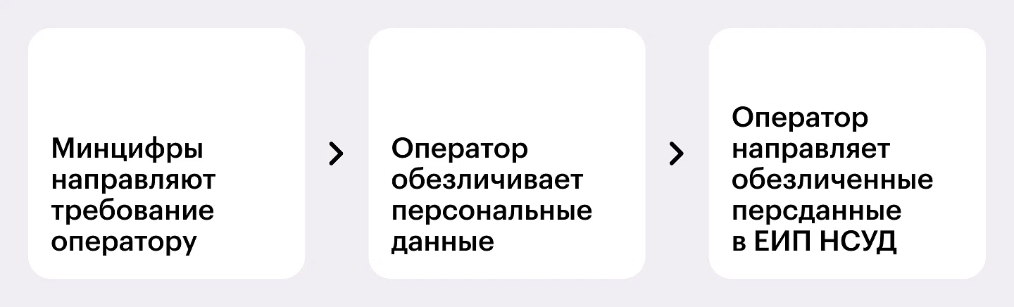 После получения требования от Минцифры, оператор должен обезличить данные так, чтобы в будущем вернуть их в исходное состояние нельзя было. Сроки Минцифры установит в своем требовании. Чтобы отправить данные, надо использовать безвозмездное ПО от Минцифры либо иную программу, которая обеспечивает необходимые методы обезличивания. Предварительно необходимо получить подтверждение возможности использовать свою программу (п. 7 Правил Постановление Правительства от 01.08.2025 № 1154). После этого можно предоставить результат в Единую информационную платформу НСУД любым из трех способов: