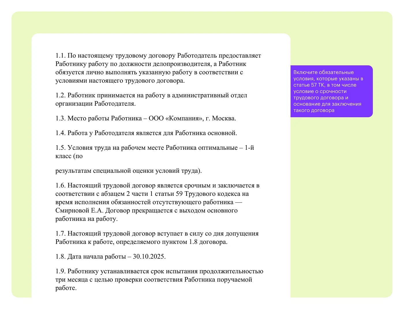 Как оформить: Примите сотрудника на работу — получите от работника документы, ознакомьте его с локальными нормативными актами, составьте срочный трудовой договор, внесите запись о приеме в трудовой книжку и в сведения о трудовой деятельности работника. Включите в срочный трудовой договор стандартные условия по статье 57 Трудового кодекса, с обязательным указанием условия о его срочном характере.
