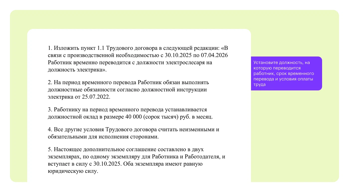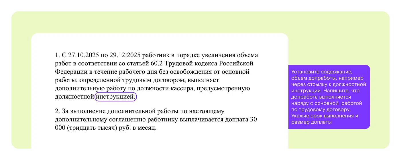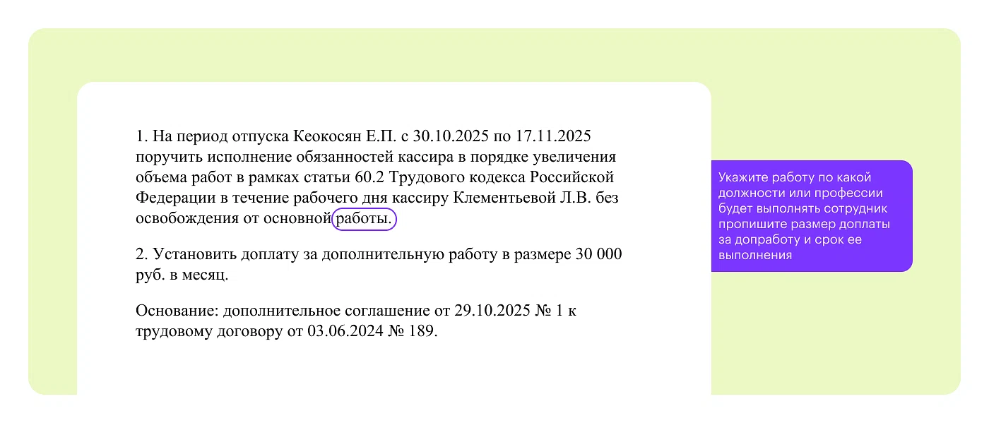 Как оформить: Заключите с замещающим работником дополнительное соглашение к трудовому договору. Укажите в документе содержание, объем работы, условие о том, что допработа выполняется в течение рабочего дня или смены работника наряду с работой, которая определена его трудовым договором, срок выполнения, размер доплаты. Можно также прописать условия досрочного прекращения такой работы.