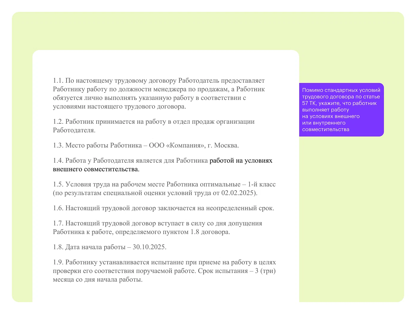 В трудовом договоре обязательно укажите, что работа, которую он будет выполнять, является совместительством. Остальные условия пропишите стандартно, в соответствии со статьей 57 Трудового кодекса.