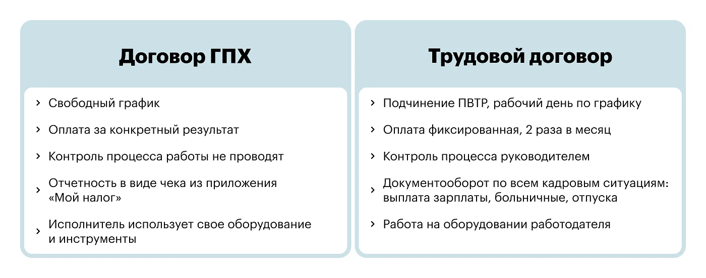 Предмет договора | Конкретная задача с измеримым результатом. Например, «написать 10 статей» | Трудовых функций, должностных обязанностей, абстрактных описаний, похожих на инструкцию |