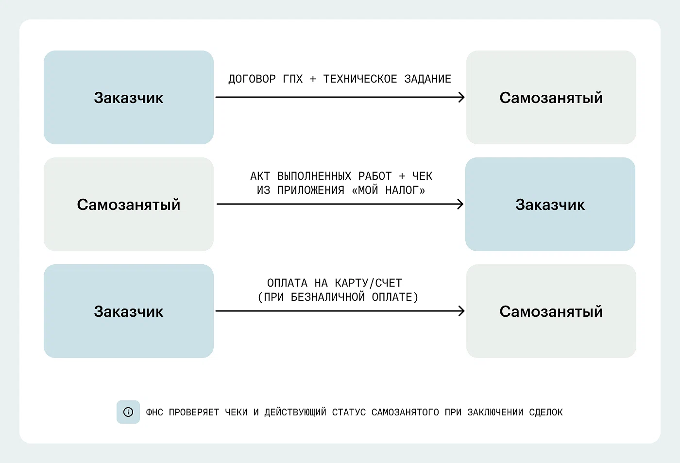 Чтобы понять, как самозанятому работать с юрлицами безопасно, обеим сторонам нужно соблюдать простые правила: проверять статус самозанятого перед каждой выплатой, следить за годовым лимитом дохода исполнителя — не более 2,4 млн руб.; не допускать в договоре и переписке формулировок, характерных для трудового договора и хранить весь пакет документов — договоры, акты, чеки и пр.