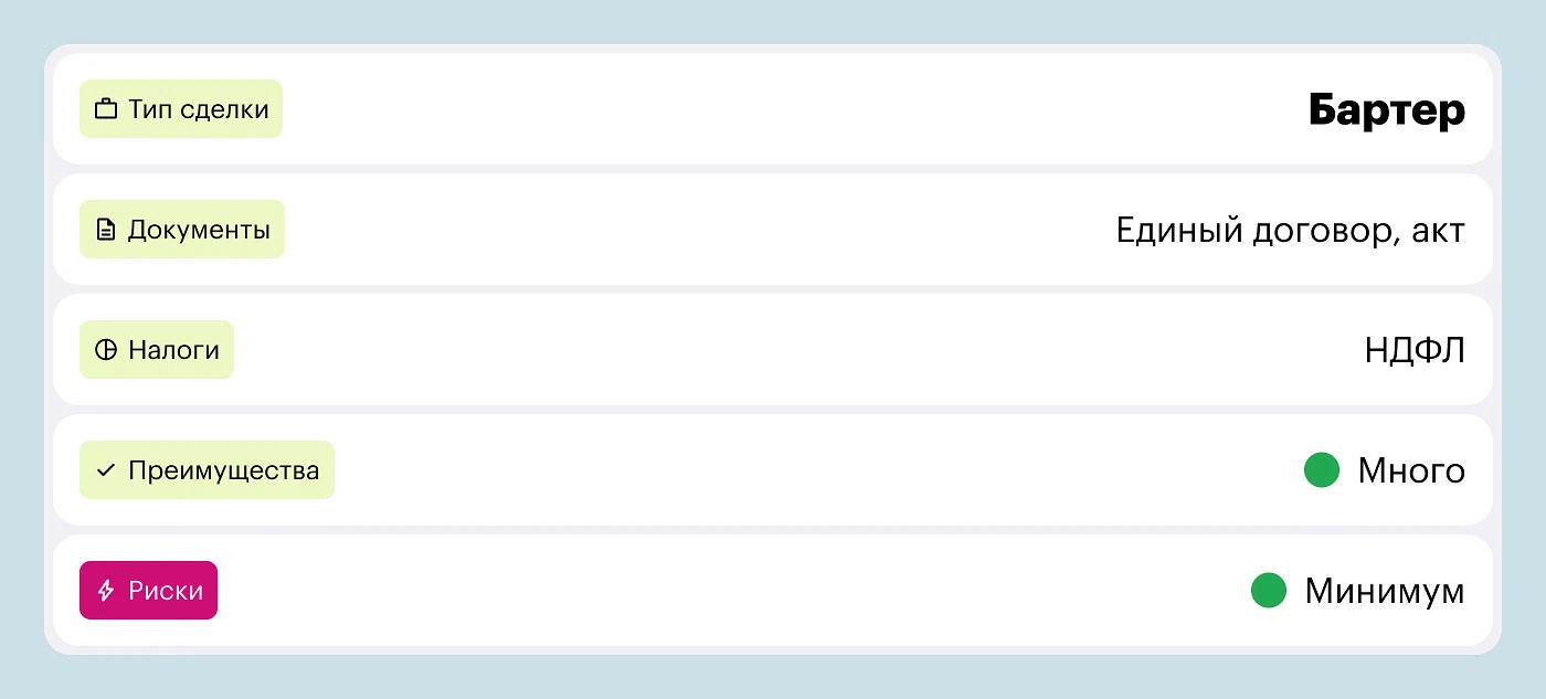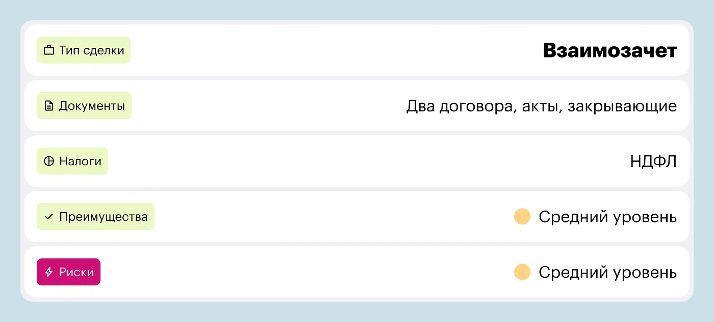 Схема взаимозачета юридически обоснована, особенно при сотрудничестве с ИП. С физлицом сделка становится немного сложнее: придется заплатить налоги и оформить больше документов. Схема юридически сложна для больших объемов, но договоры типовые, поэтому часть процесса можно автоматизировать через шаблоны и CRM.