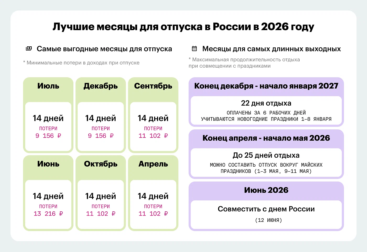Оптимальные периоды: июль (потери 9 156 рублей/14 дней), август (13 216), сентябрь и октябрь (по 11 102), декабрь (9 156). Минимум праздников, стоимость дня близка к компенсации.