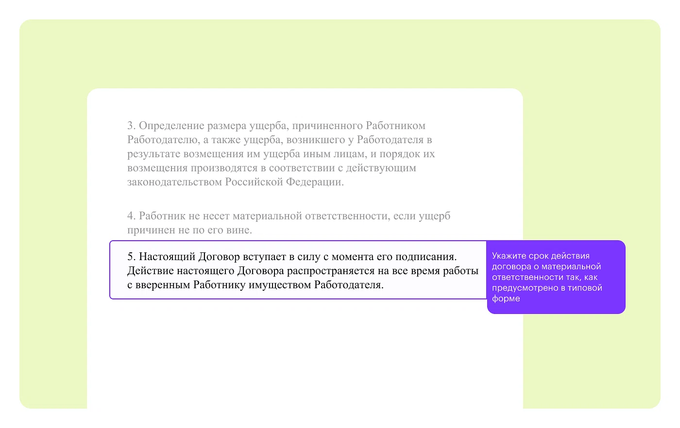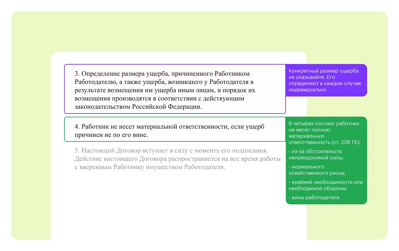 Включите в договор формулировку из типовой формы о том, что работник несет полную материальную ответственность. Указывать конкретную сумму возмещения ущерба не нужно — по закону это невозможно. Ответственность может быть только ограниченная по закону или полная по договору.