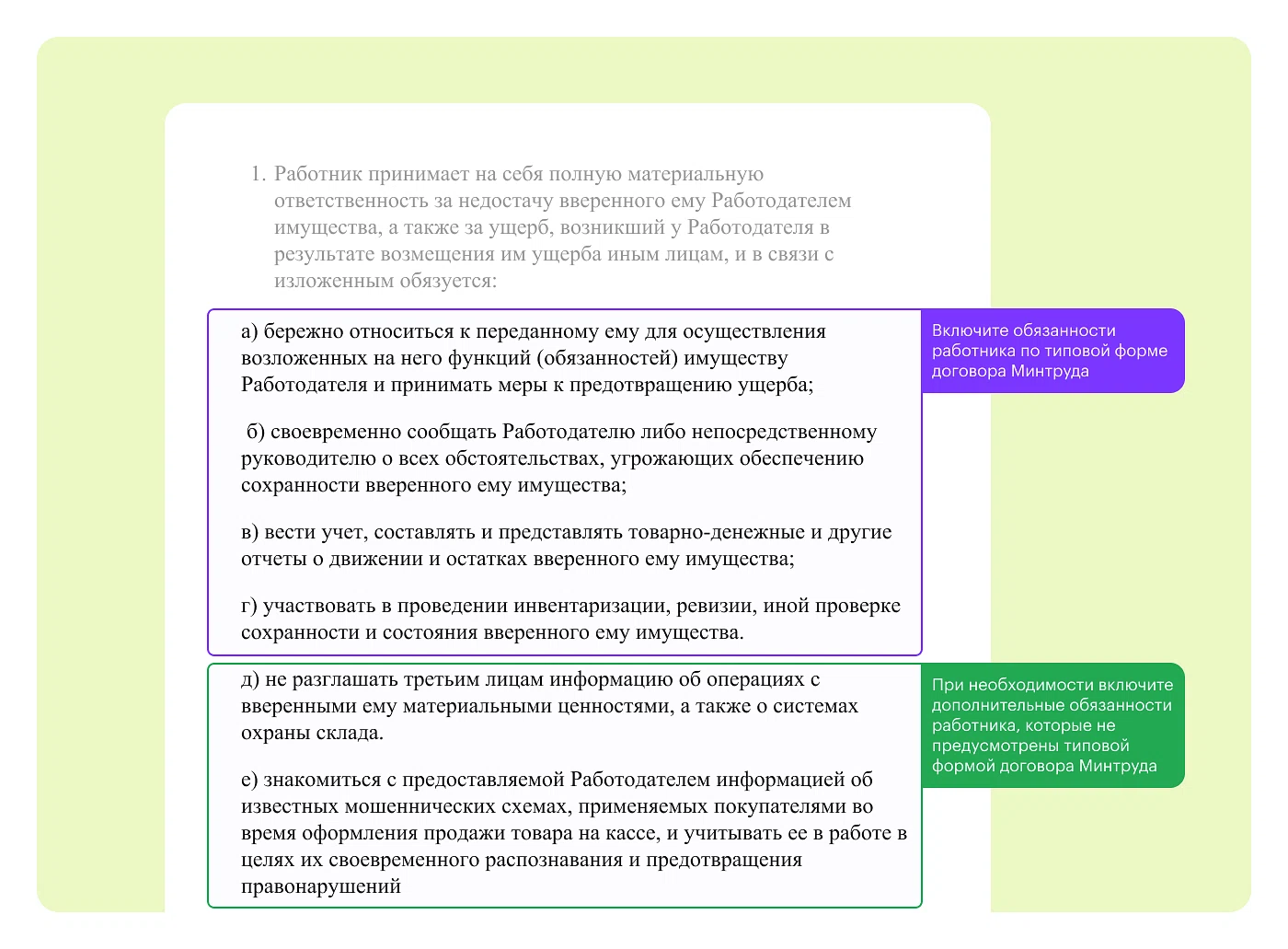 Чтобы закрепить полную материальную ответственность, с работником заключают договор по типовой форме. При этом неважно, трудится работник на спецдолжности по основному месту работы или по совместительству (ст. 244 ТК РФ). Убедитесь, что название должности работника соответствует названию должности из перечня Минтруда, а в должностной инструкции есть формулировка обязанности из перечня работ, которые выполняют работники с полной материальной ответственностью (разд. I и II приложения к приказу Минтруда № 251н).