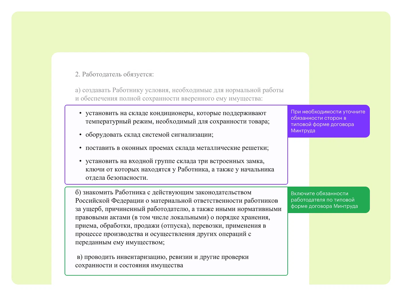 Включите в договор общие обязанности для работника и работодателя, которые предусмотрены в типовой форме договора Минтруда. По ним работник обязан бережно относиться к переданному ему имуществу, вести учет, составлять и предоставлять товарно-денежные и другие отчеты о движении и остатках имущества и пр. А работодатель проводит инвентаризацию, ревизии и другие проверки сохранности имущества.