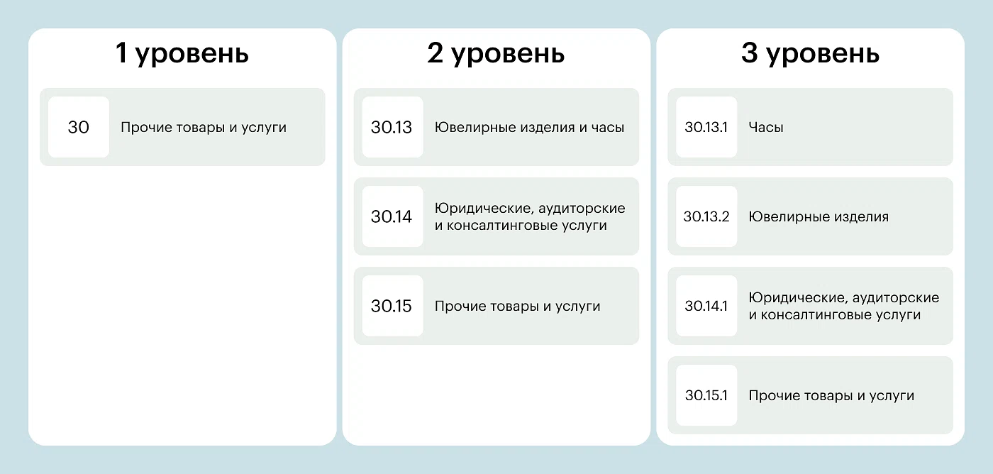 В ККТУ обозначены три уровня товаров и услуг. Например, более широкий уровень «Прочие товары и услуги» число 30. Его часто используют, когда невозможно подобрать абсолютно подходящий вид товаров или услуг. Второй уровень более конкретный «Ювелирные изделия и часы» — 30.13. А третий уровень сужает поиск кода до конкретного товара — «часы». В итоге получаем код 30.13.1. Его и нужно вводить в ОРД.