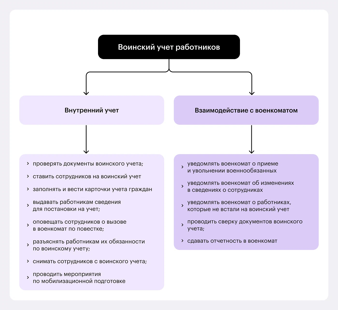 Поручите ответственному сотруднику выполнять обязанности по воинскому учету. Подробнее о них на схеме ниже.