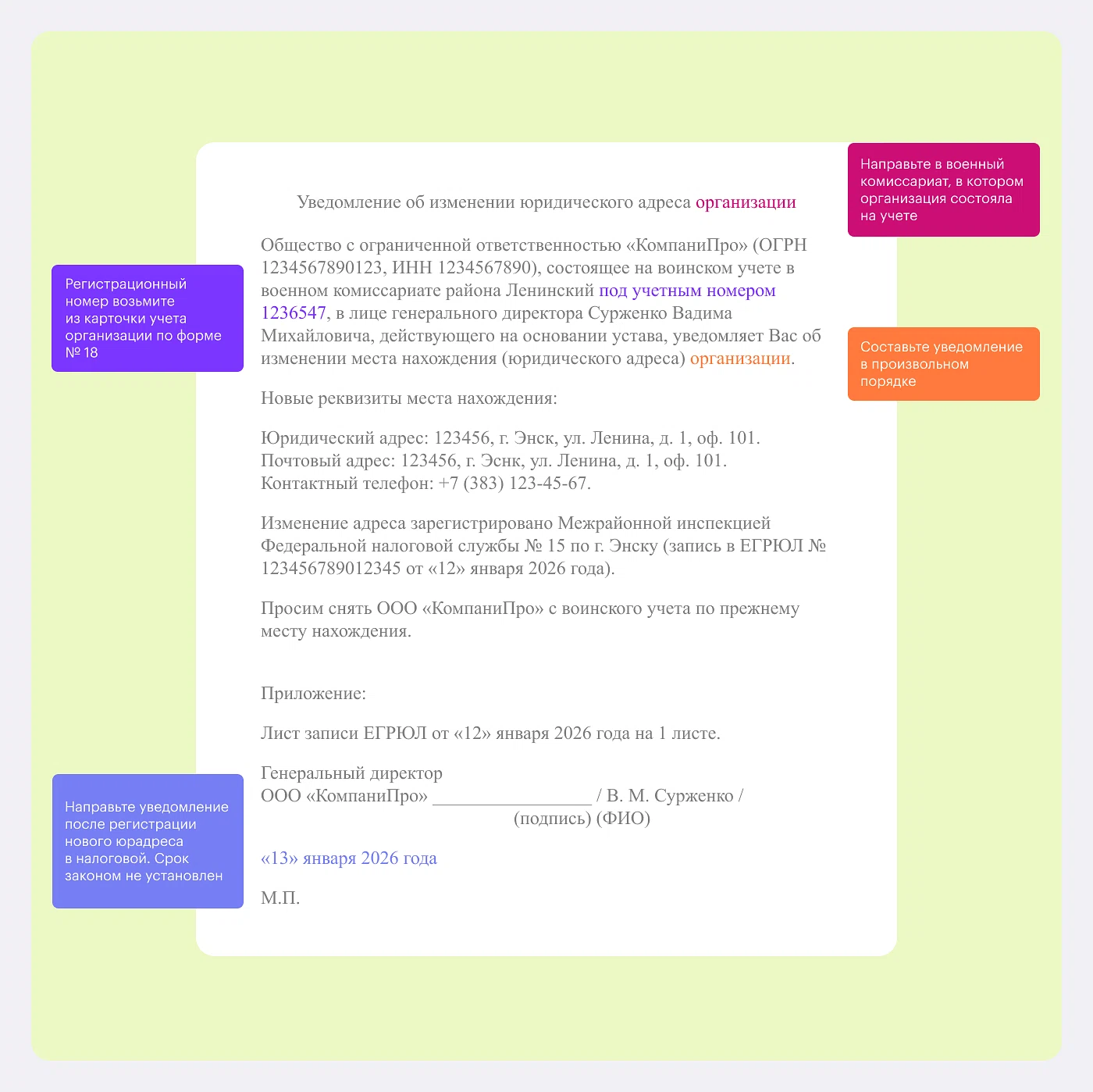 Чтобы уведомить военкомат о смене юрадреса компании, составьте письмо в произвольной форме и направьте его в военкомат по предыдущему месту нахождения организации. Сроков для подготовки и направления такого уведомления нет — рекомендуем сделать этого в течение недели после регистрации изменений в налоговой.