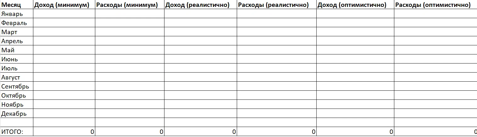 Прогноз выручки на год. Начните с трех сценариев: минимальный, реалистичный, оптимистичный. Для каждого сценария укажите месячные значения и итог за год. Делайте прогноз по месяцам, потому что доходы в бизнесе редко равномерны, могут быть значительные расхождения.