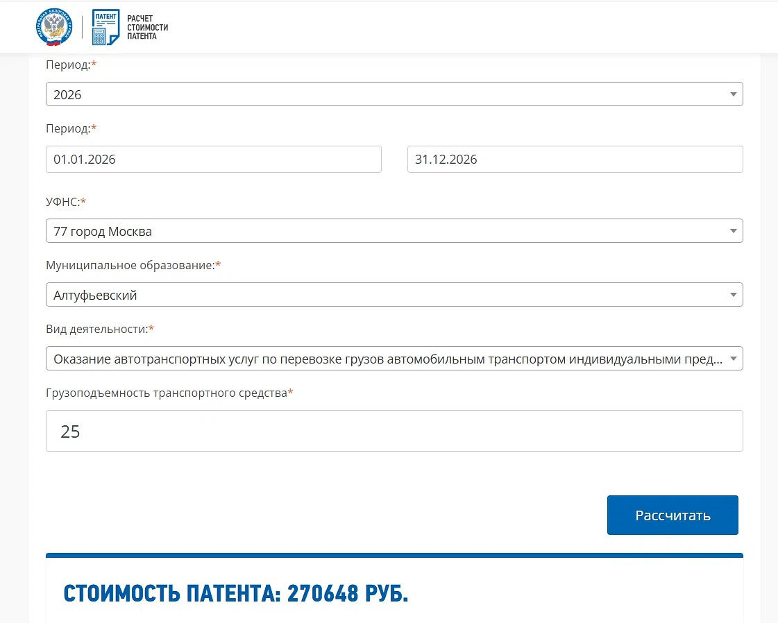Стоимость патента не зависит от реального дохода бизнеса. Его рассчитывают региональные власти, опираясь на примерные подсчеты, сколько может заработать ИП на этом виде деятельности в этом регионе. Рассчитывать патент на транспортные услуги 2026 для ИП нужно по формуле: Стоимость патента = Потенциальный доход х 6% (налоговая ставка). Но удобнее всего проверить стоимость в калькуляторе ФНС. Например, патент на грузоперевозки в Москве сроком на 12 месяцев будет стоить 270 648 рублей.
