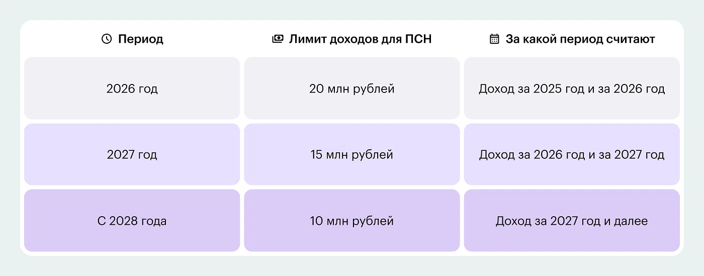 Ранее находиться на патентной системе налогообложения можно было при доходе не более 60 млн в год. С 2026 года бизнес теряет право на патент, если доход превысил 20 млн рублей либо в текущем году, либо в предыдущем. Это значит, что ИП не может находиться на патентной системе, если за 2025 год или в течение 2026 года его доходы превысили 20 млн рублей. Аналогичное правило действует и в последующие года. В 2027 году — лимит 15 млн в год, в 2028 — 10 млн в год.
