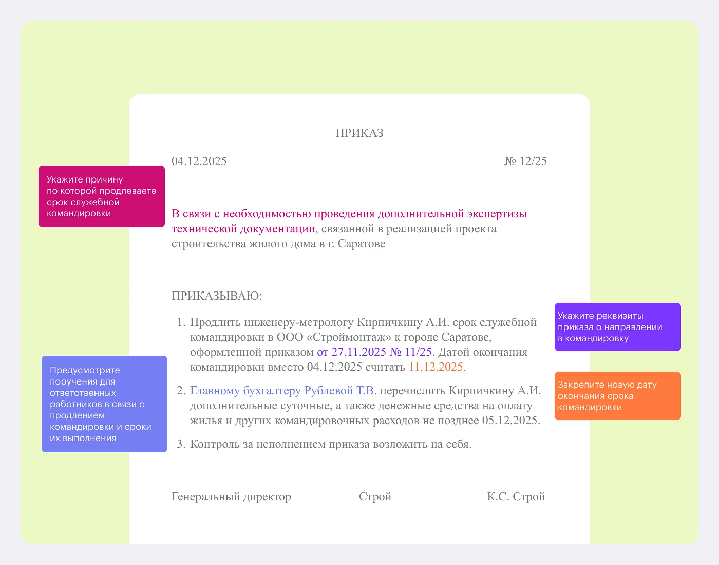 В приказе укажите причины изменения продолжительности командировки, новую дату окончания командировки, поручения ответственным работникам.