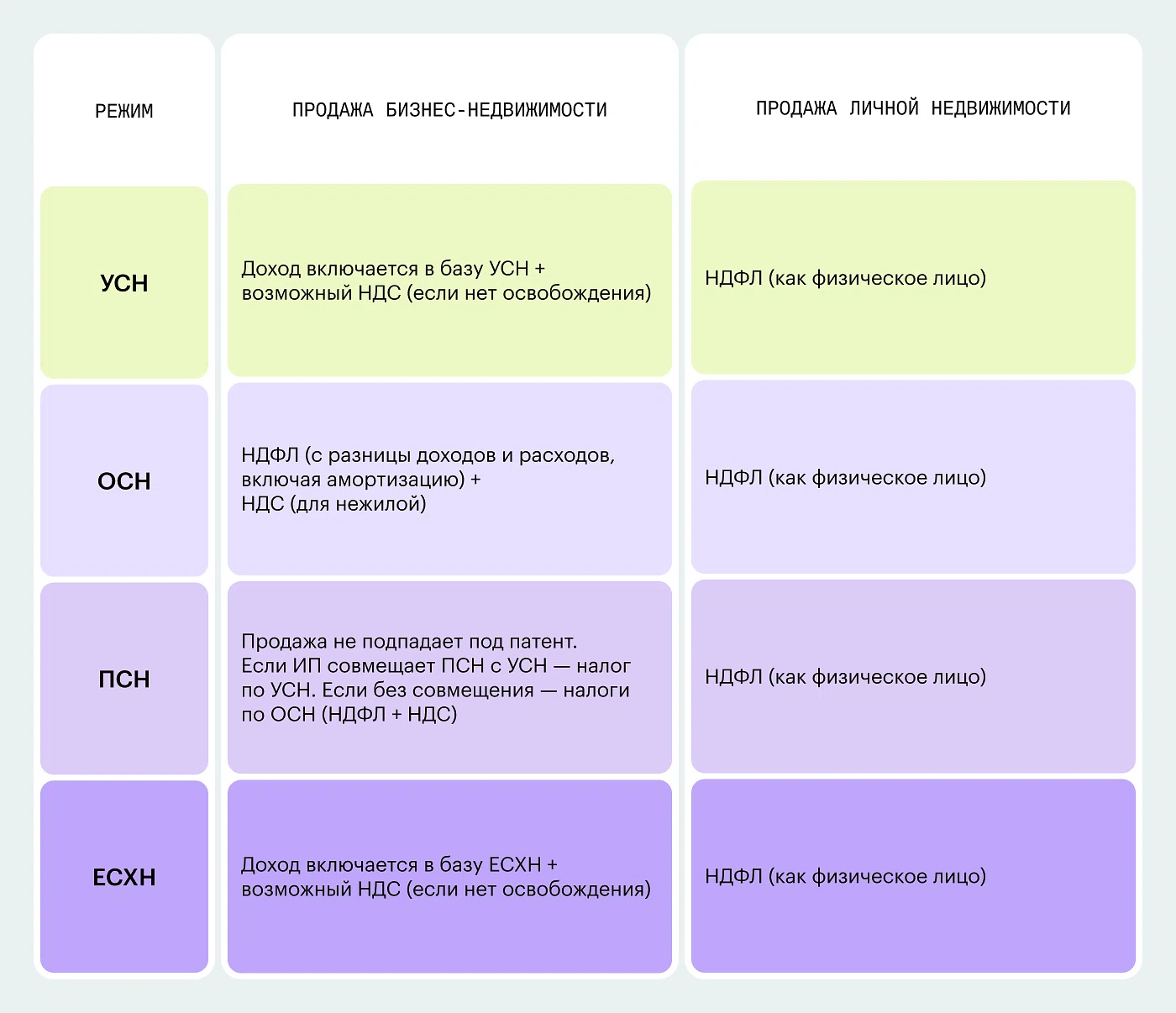 Если же ИП использовал объект только для личных нужд, то налог платится как с физического лица — по НДФЛ с возможностью применения вычетов или освобождения после минимального срока владения. Например, недвижимость физлица использовалась для проживания.