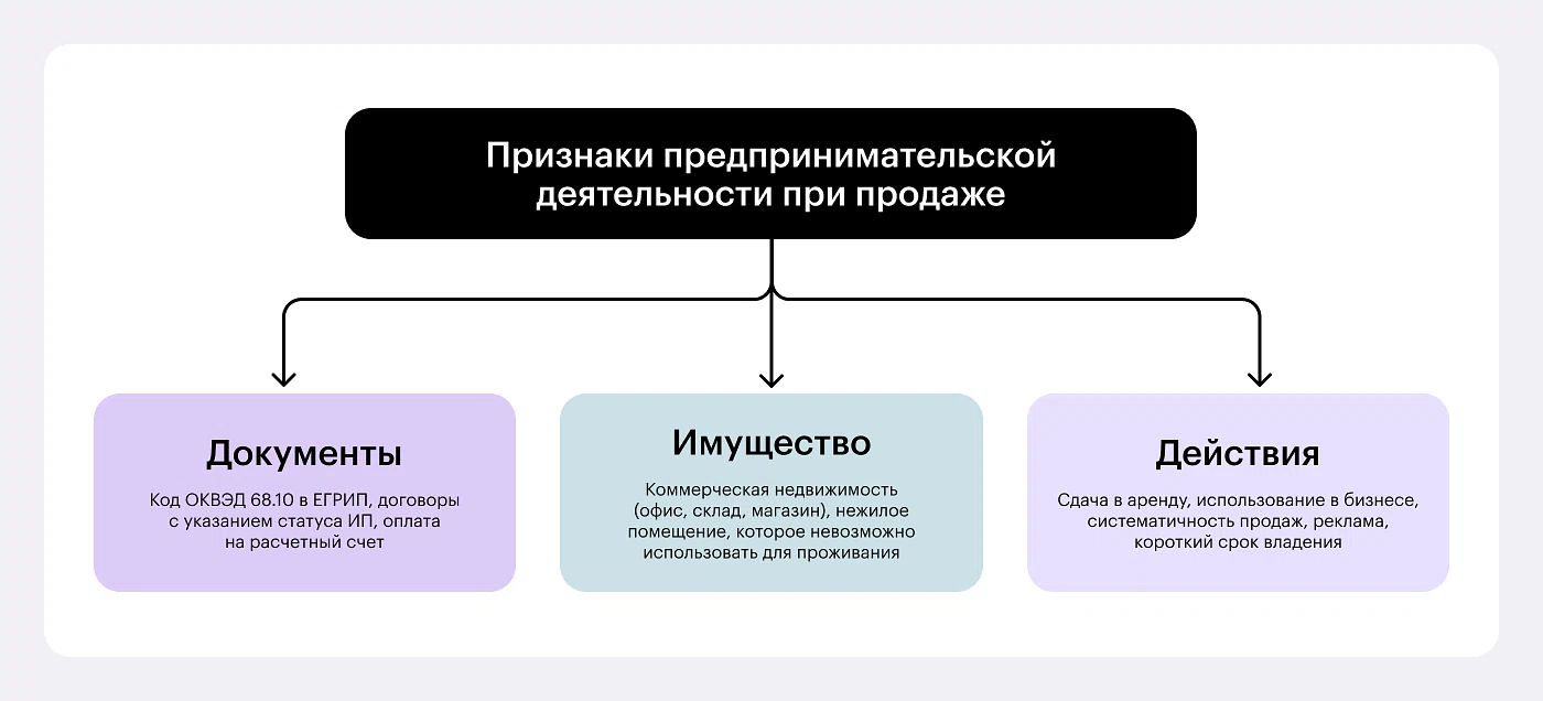 Чтобы понять, недвижимость физлица продается как личное имущество или она использовалась для предпринимательской деятельности, контролеры используют совокупность признаков, которые условно можно разделить на три группы: документы, вид имущества и действия.