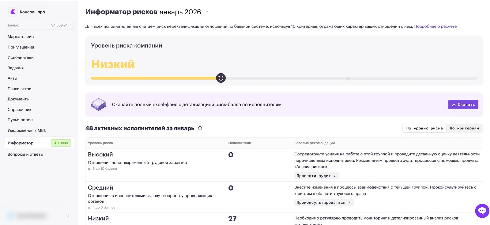 Однако цель персонального менеджера — не только техническая поддержка, но и стратегическое погружение в бизнес-процессы. Ольга показала Максиму модуль «Информатор», который оценивает общий уровень юридического риска компании. Оказалось, что по риску переквалификации трудовых отношений «Пять Ноль» находится в оранжевой зоне.