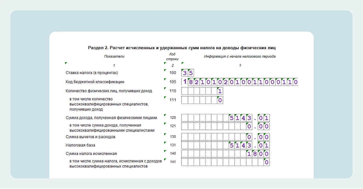 В строке 120 раздела 2 указывают размер матвыгоды за месяцы отчетного периода, в которых сотрудник пользовался займом. В строке 140 — исчисленный НДФЛ. Если налог не удержан, заполняют строку 170.