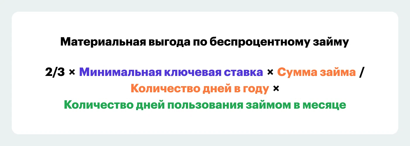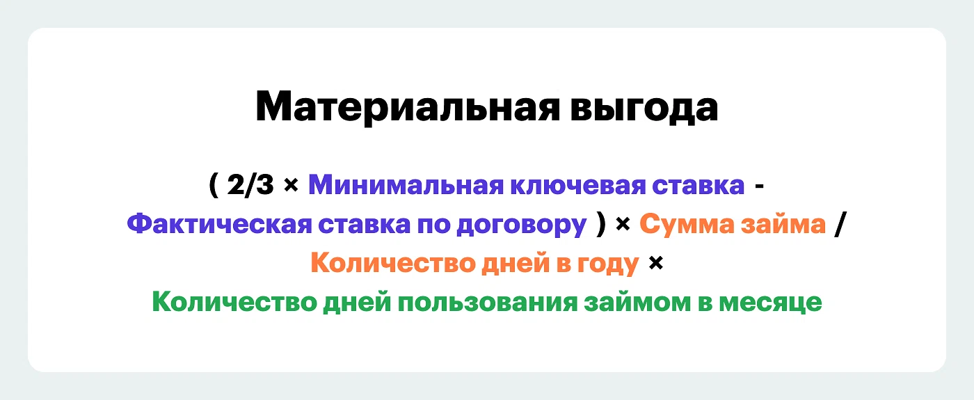 Материальная выгода1 = (2/3 × Минимальная ключевая ставка — Ставка по договору) × Сумма займа на начало периода / Дней в году × Количество дней в периоде.