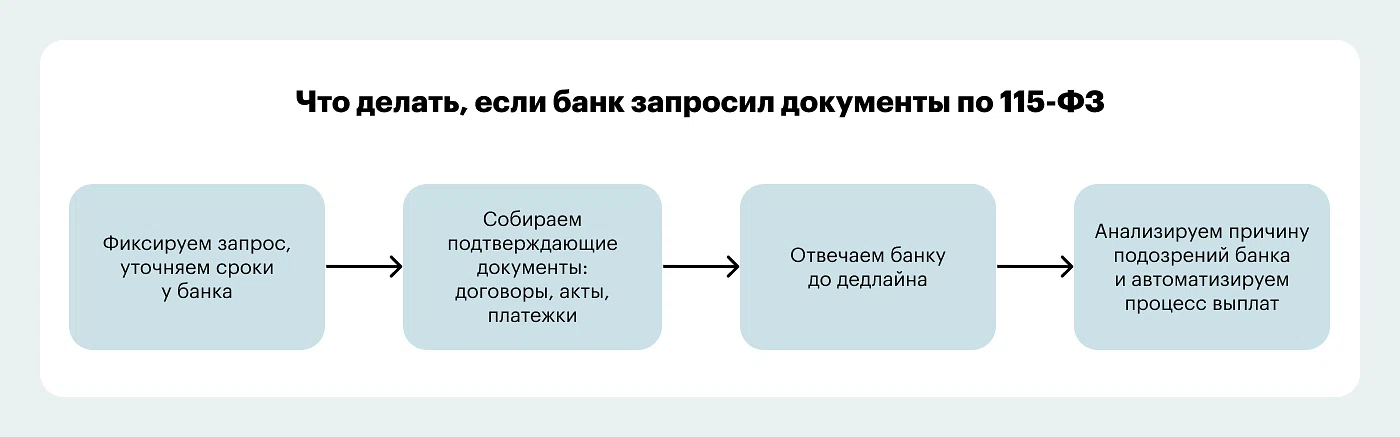В беседе подтвердите, что получили запрос банка, уточните статью 115-ФЗ, в рамках которой проверяют ваши операции с физлицами, уточните сроки и формат ответа на запрос по вашему бизнесу.