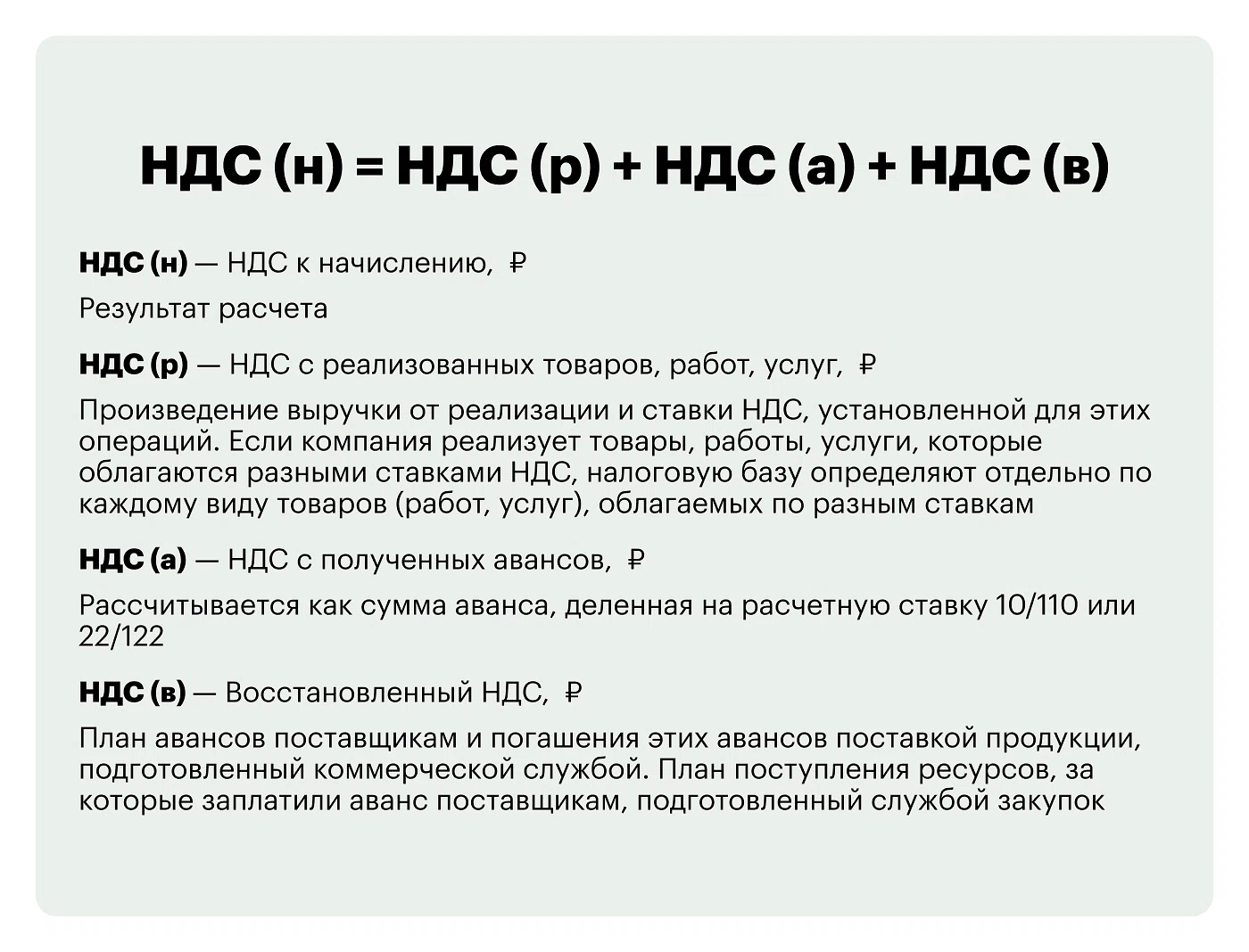 Однако этого недостаточно, чтобы рассчитать налоговую нагрузку по НДС. Это всего лишь исходящий НДС. Для полной картины нужен еще расчет вычета — входящий НДС и НДС к уплате или возмещению.