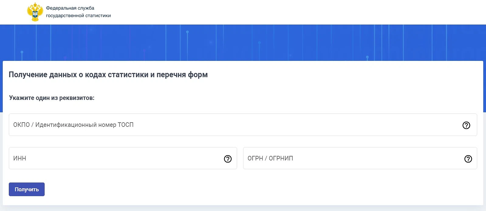 Система принимает любой из трех идентификаторов: ИНН, ОГРН для юрлиц или ОГРНИП для ИП, ОКПО. На практике удобнее всего использовать ИНН. В ответе будет два блока. Первый — статистические коды: ОКПО, ОКАТО, ОКТМО, ОКФС. Второй — перечень форм статистики по ИНН, которые вы должны сдать. Для каждого отчета в таблице указан срок сдачи и даны пояснения по заполнению. Все актуальные формы можно скачать прямо с сайта.