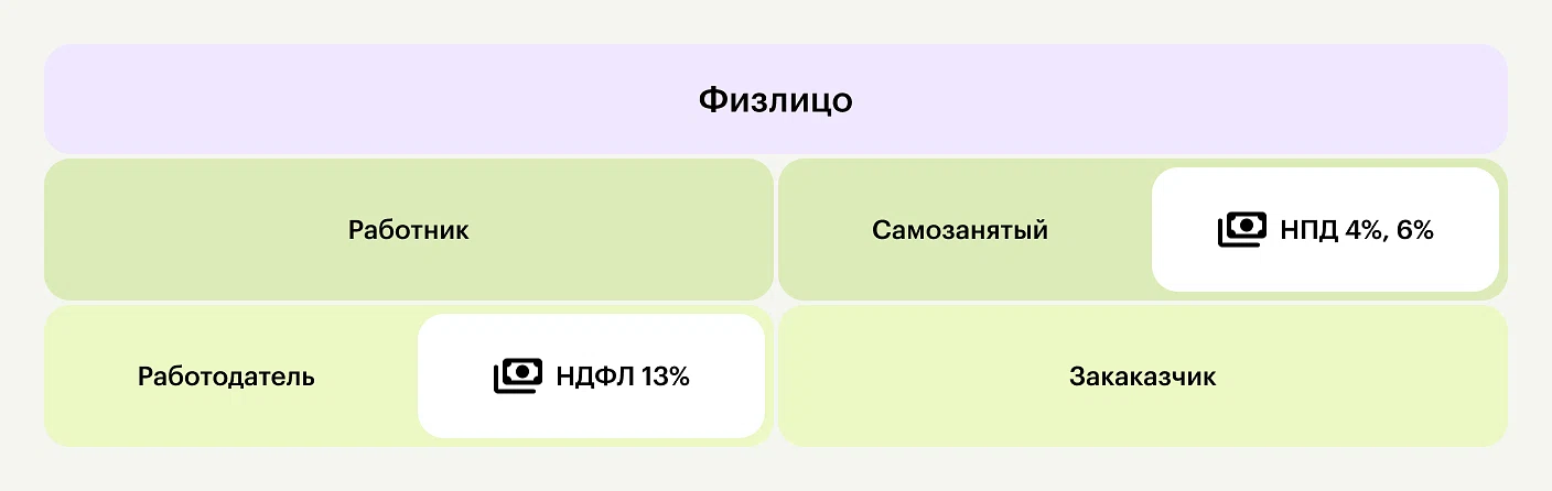 Пример. Юрист уволился с постоянной работы и стал самозанятым. Но бывший работодатель иногда обращается к нему за помощью. В таких случаях юрист оказывает услуги как физлицо по договору подряда. Бывший работодатель платит за такие услуги НДФЛ 13% и страховые взносы.