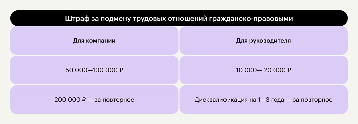 Еще один штраф — от 50 тыс. до 100 тыс. руб. — грозит компании за нарушение трудового законодательства (п. 4 ч. 1 ст. 5.27 КоАП).