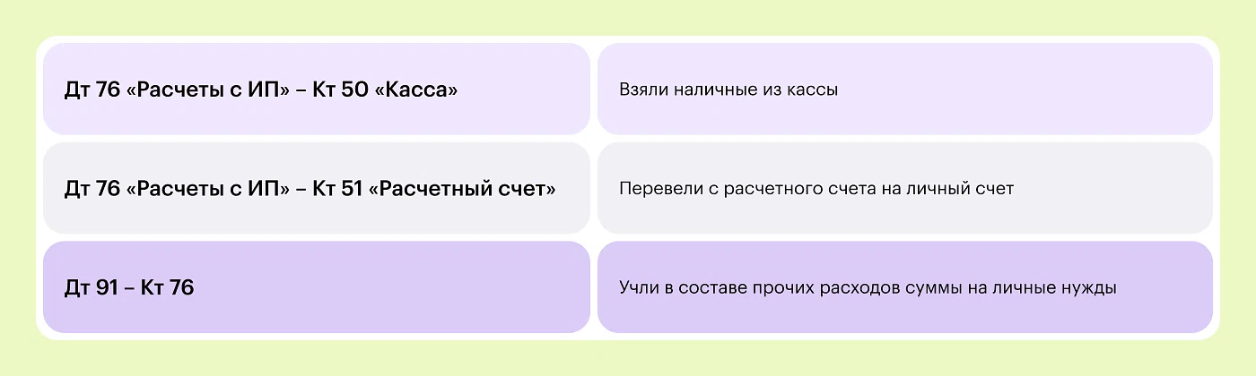 Индивидуальные предприниматели не обязаны вести бухгалтерский учет (пп. 1 п. 2 ст. 6 Федерального закона от 06.12.2011 № 402‑ФЗ). Желательно вести учет расходов на личные нужды, чтобы потом случайно не оказаться с нулем на расчетном счете. Если предприниматель решил вести полный бухгалтерский учет, для контроля личных расходов можно открыть к счету 76 специальный субсчет «Расчеты с ИП». На этом субсчете удобно отражать все операции с деньгами, которые уходят на личные нужды.