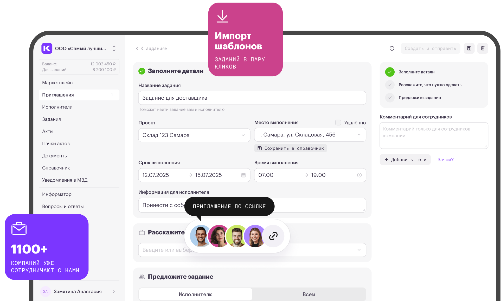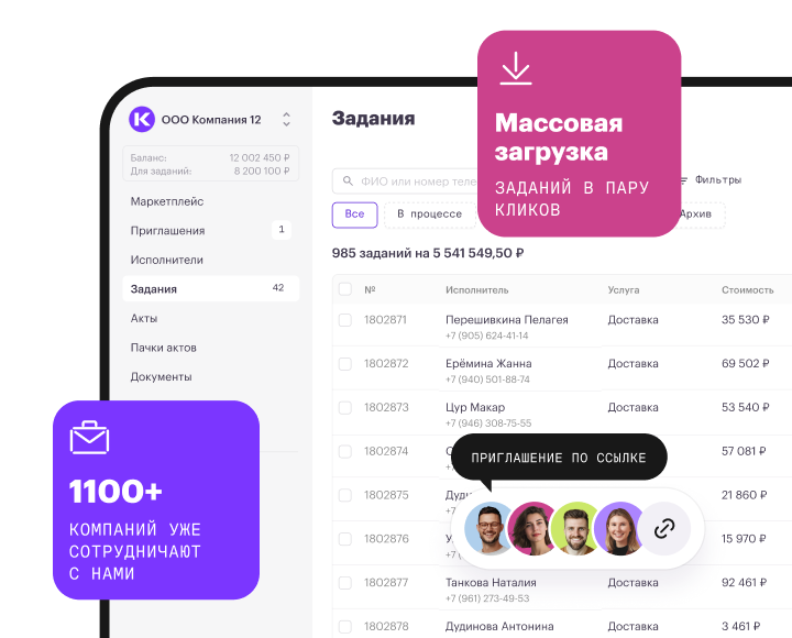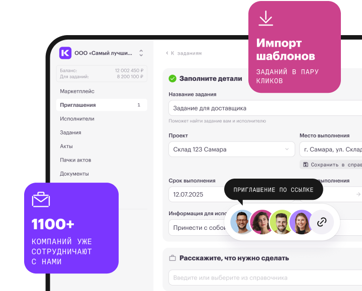 Оставьте заявку и уже через несколько минут менеджер свяжется с вами. Специалист проведет демонстрацию платформы, а выделенный эксперт по внедрению настроит ее под ваши задачи. Вы сразу сможете приглашать исполнителей и работать с ними.
