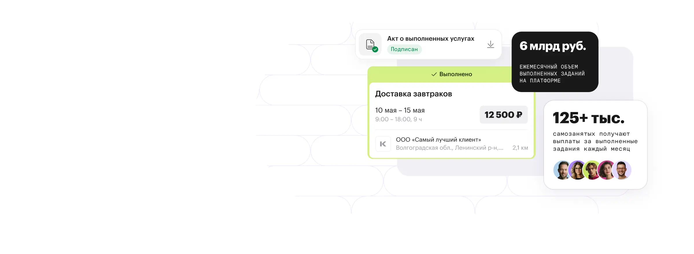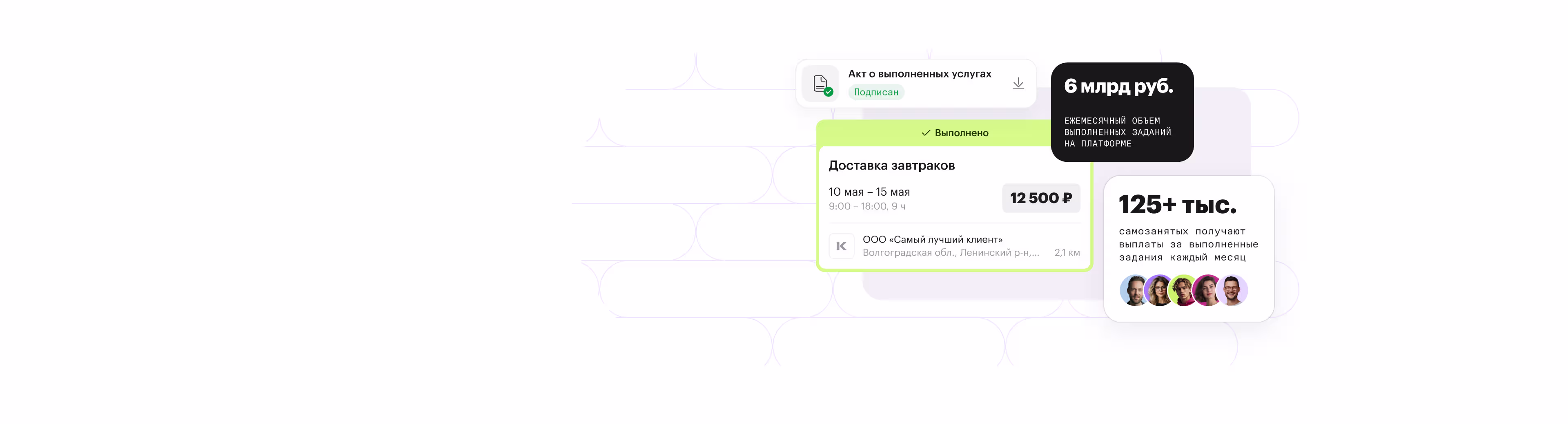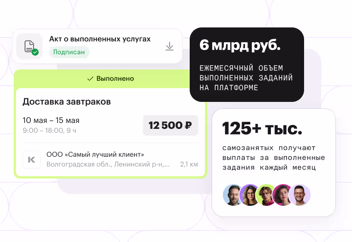 Платформа осуществляет моментальные выплаты самозанятым, выплаты физлицам без статуса по договору ГПХ, ИП, иностранцам. После того, как исполнитель принял задание, выполнил его и подписал акт, платформа переведет вознаграждение.