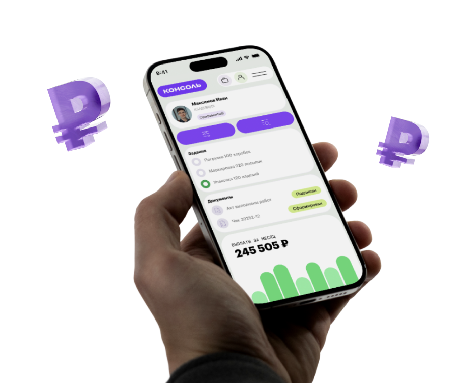 Платформа построена на согласованной с банком и юристами схеме, которая позволяет законно осуществлять выплаты исполнителям в статусе самозанятых. Сервис предоставляет готовую оферту, инструкции и сопровождение — это гарантирует безопасность и исключает риски блокировок. Подключив сервис Консоль, вы сможете проводить исполнителям массовые выплаты за выкупы на Ozon, выплаты за выкупы на Wildberries и других маркетплейсах.