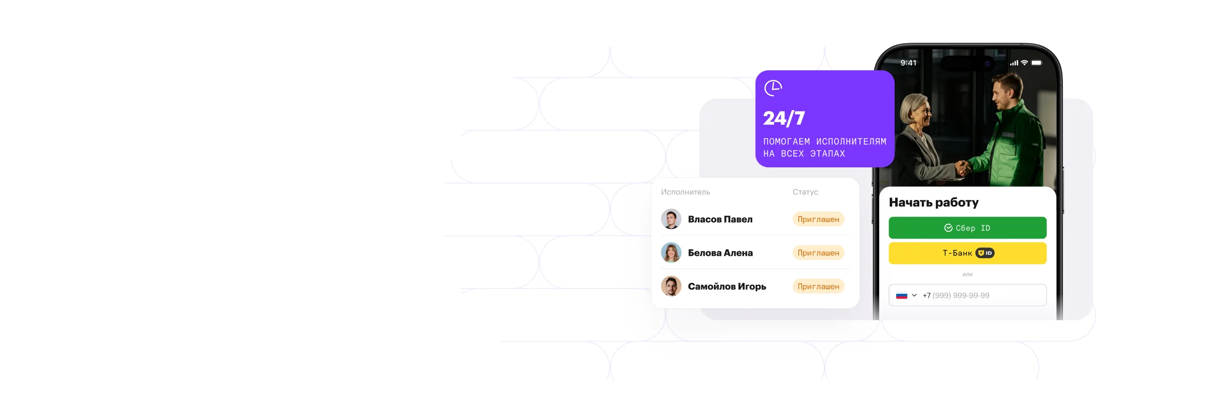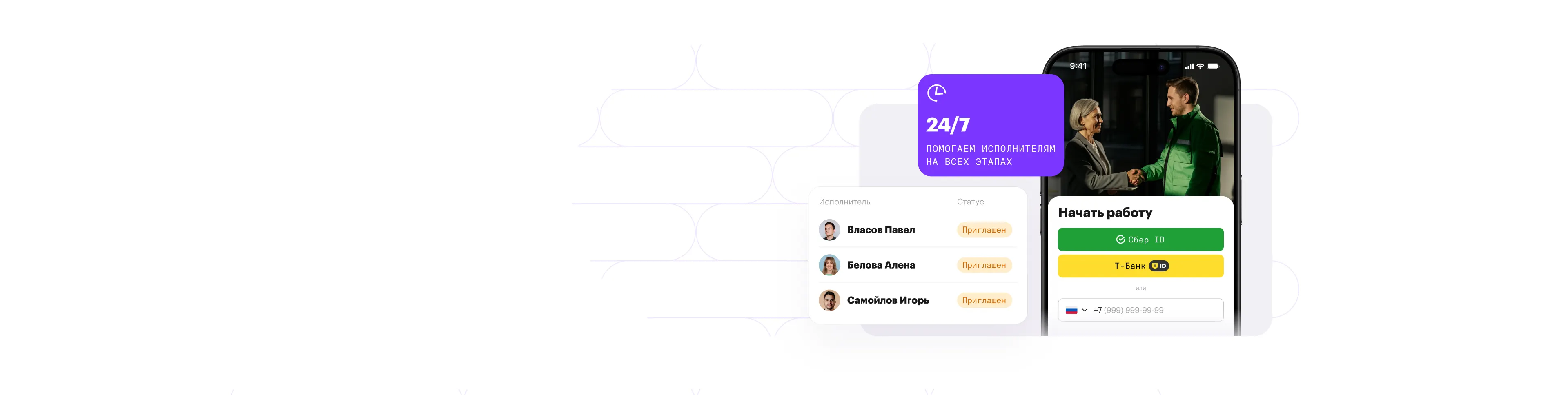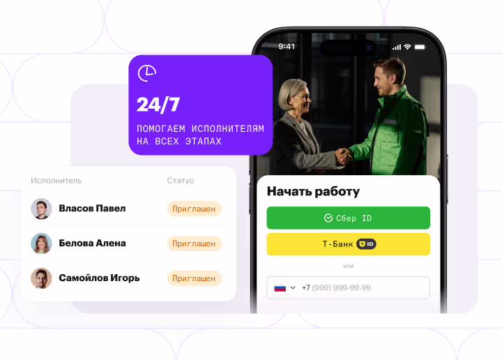 Если у исполнителя есть счет в Сбере или Т-Банке, он может авторизоваться на платформе за несколько секунд, не заполняя большую часть анкеты. Ему не придется подтверждать номер телефона, сканировать документы и вводить реквизиты счета.