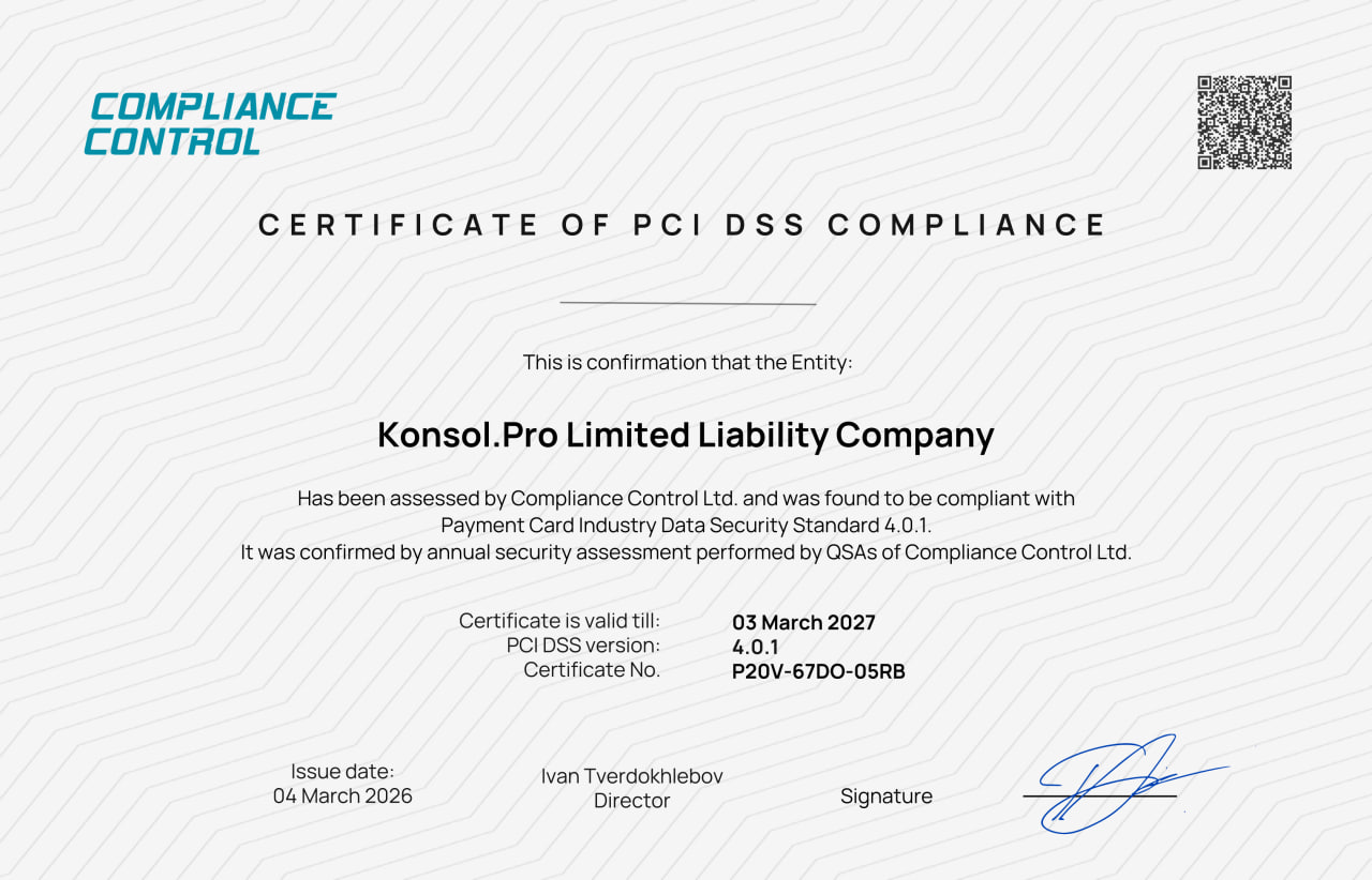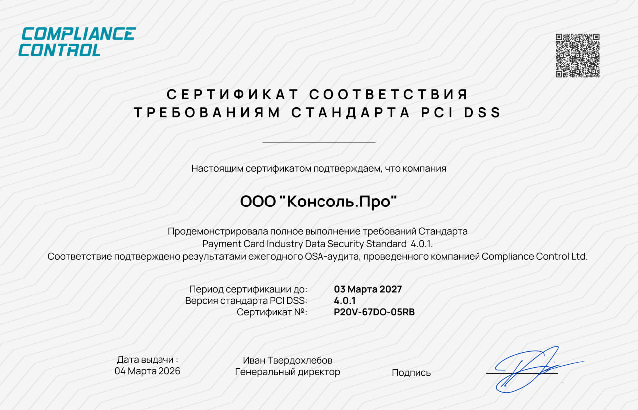 Консоль.Про располагается в облачной инфраструктуре Яндекс Облака, с центрами обработки данных на территории Российской Федерации, которые соответствуют международным стандартам и законодательству, например PCI DSS, № 152-ФЗ «О персональных данных», ГОСТ Р 57 580.
